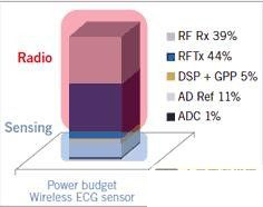 功耗可通過檢查傳感器的單獨標準構件來預算心電圖傳感器節點的功率:傳感和讀取單元、無線通訊、數字信號處理器(DSP)和供電單元。顯然,節點中最耗電的是射頻芯片,射頻芯片負責傳感器數據的無線傳輸(圖5)。通常,實現無線通訊功能所耗費的功率占總功率預算的50%至85%。