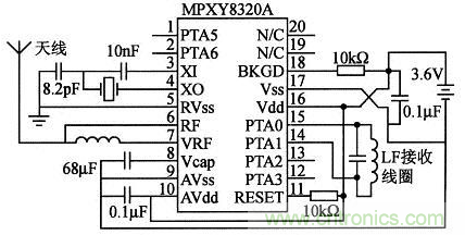 檢測模塊由胎壓測量專用高集成芯片MPXY8320A微控制器和電源組成,檢測模塊電路原理如圖4所示。MPXY8320A工作在DC 2.1~3.6 V,具有低功耗的效能以延長電池壽命。MPXY8320A最大的特點是,其內部集成了8位MCU、適應載重型輪胎的壓力傳感器、溫度傳感器、供電電源電壓監測、X-Z軸上的加速度傳感器以及RF發送模塊,所以MPXY8320A是一款專為交通工具胎壓測量而設計的高集成芯片。由于器件的高集成度,在體積上、功耗上、電磁兼容性方面都有很出色的表現。